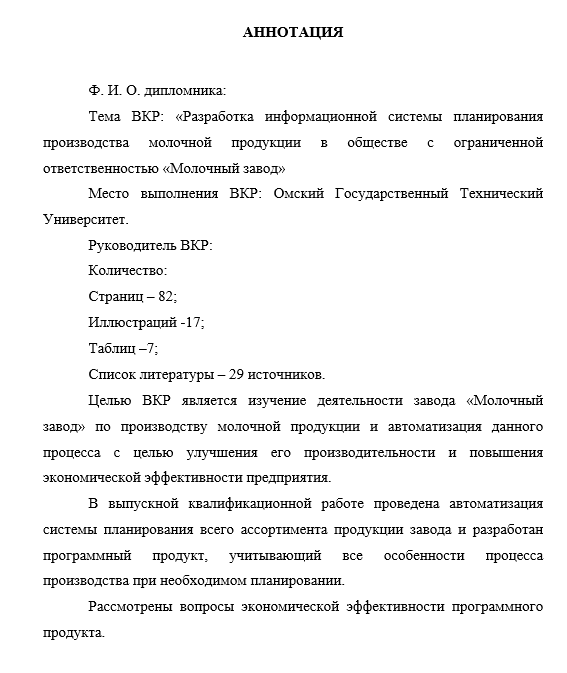 Для членов комиссии краткая аннотация к ВКР является единственной частью работы, которую они просмотрят, прежде чем принять решение - знакомиться с работой подробнее или нет. Поэтому, написанию аннотации необходимо уделить значительное внимание. Аннотация представляет собой краткую характеристику работы, содержащую перечень основных вопросов, рассматриваемых в работе. В аннотации отмечаются особенности и достоинства работы, что помогает читателю понять, стоит более подробно с ней знакомиться.Как правило, аннотацию в дипломе нужно вставлять перед титульным листом или сразу после него. Таким образом, аннотация в дипломе не нумеруется, так как не входит в содержание работы. Аннотация к ВКР магистра составляется по тем же правилам, что и для бакалаврских работ. Перед включение аннотации в итоговую работу ее в обязательном порядке должны проверить научный руководить и руководитель от кафедры. Без их одобрения помещать аннотацию в диплом не рекомендуется во избежание вопросов со стороны комиссии.