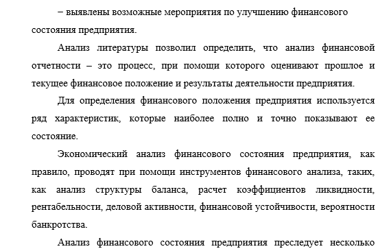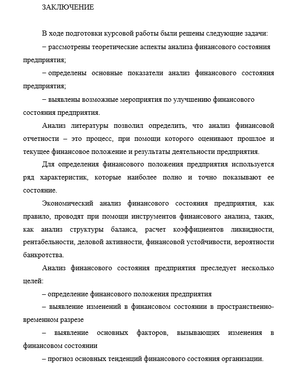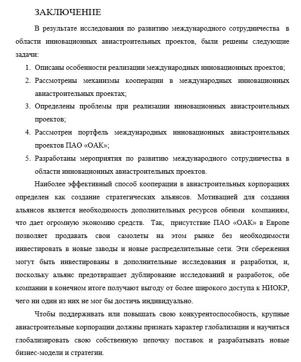 В заключении к ВКР раскрывается значимость рассмотренных вопросов по теме ВКР, приводятся главные выводы, характеризующие в сжатом виде итоги проделанной работы и достижение цели; их столько же, сколько поставленных задач. Излагаются предложения и рекомендации по внедрению полученных результатов исследования и дальнейшему развитию темы. Выводы и рекомендации обязательно формируются в виде нумерованных или маркированных списков. Как правило, в заключении диплома не вставляются ссылки на источники, так как оно должно отражать исключительно самостоятельный анализ. Объём заключения составляет 2–4 страницы (5% от общего объема диплома). Заключение нумеруется совместно со всей содержательной частью выпускной квалификационной работы. Сразу после него помещается список литературы.Пример заключения к ВКР